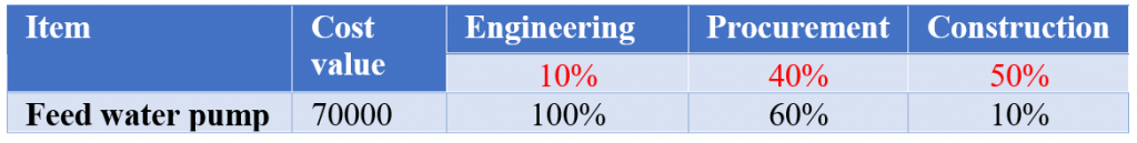 1- There is a set of weight values for EPC (kind of benchmark) which gets used by planners and project’s team. According to this set the Engineering W.V is 10%, Procurement is 40% and construction is 50%. Then, the planner gets instructed to use them in calculating the progress in conjunction with the Cost report (might be called BOQ Cost as well). For example, there is a line item in the cost report of a Feed water pump for $70k, then the planner develops an Excel file similar to the table below: