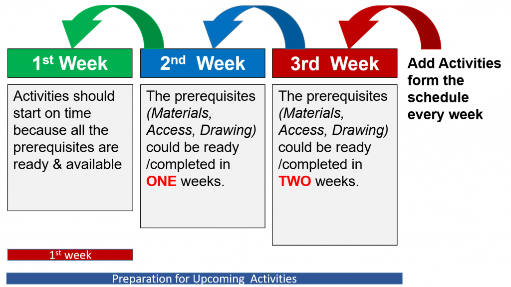 As the image shows, the process is dynamic and requires undertaking in two different layers. First layer is the current week’s activities and the 2nd layer is working on the upcoming activities. These 2 layers run in parallel.