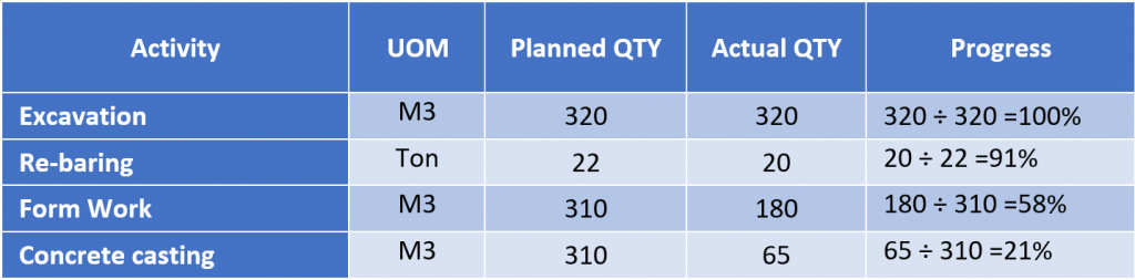 2- The next table illustrates some Construction activities whose progresses have been calculated.
