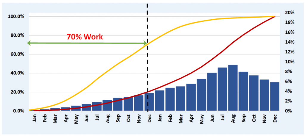 - The Planned curve should demonstrate the cumulative work distribution
